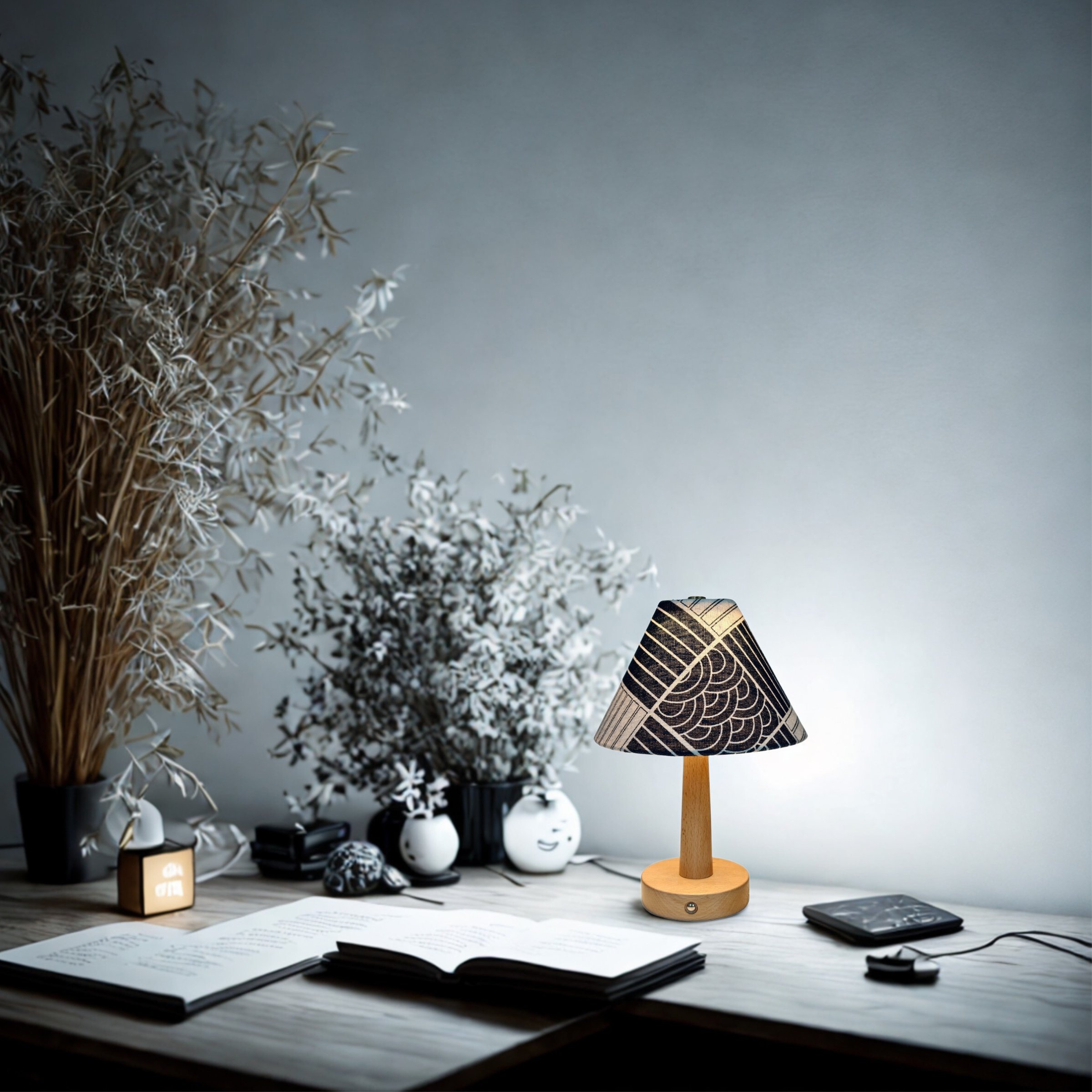 Material: Fabrics shade,wood base,Iron rod,LED Component